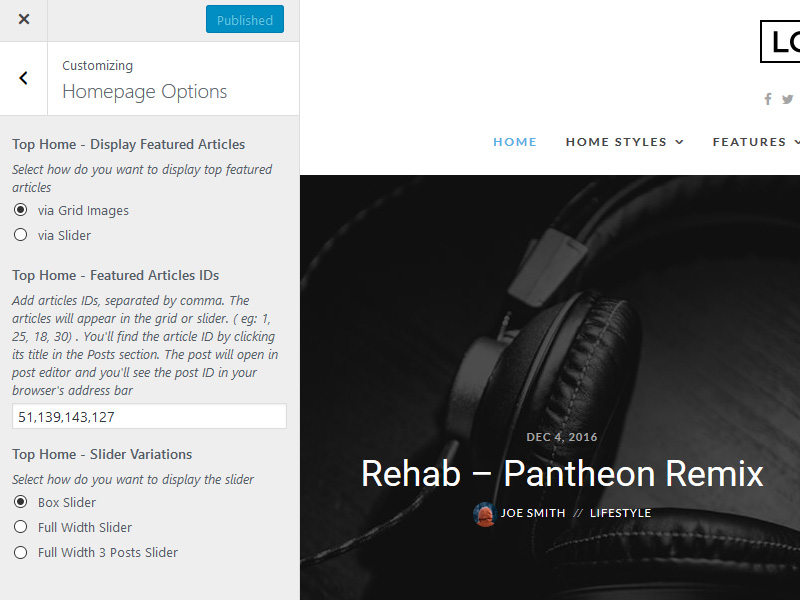 In order to add the home slider or the grid images, go to Appearance > Customizer > Homepage Options. In the Top Home - Display Featured Articles select how to display the posts. If you select via Slider go to Top Home - Slider Variations and choose an option. In the Top Home - Articles IDs field add the articles IDs you want in the slider / grid , separated by comma.