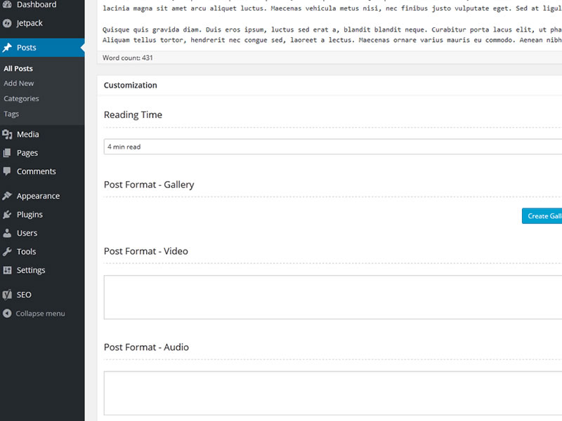 Below Text Editor you'll see Customization box. There you can add, reading time or choose one of the post formats ( audio, gallery, video ) and fill their boxes.