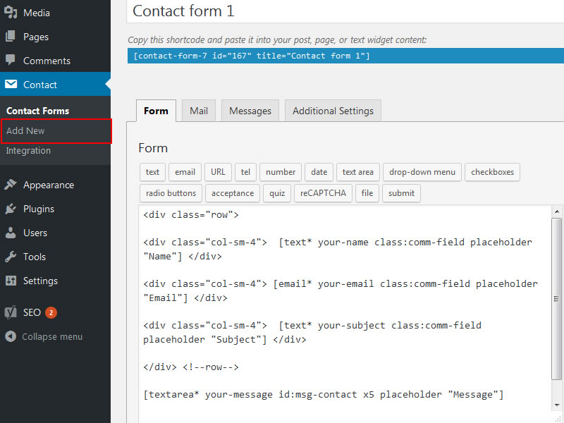 <div class="row"> <div class="col-sm-4"> [text* your-name class:comm-field placeholder "Name"] </div> <div class="col-sm-4"> [email* your-email class:comm-field placeholder "Email"] </div> <div class="col-sm-4"> [text* your-subject class:comm-field placeholder "Subject"] </div> </div> <!--row--> [textarea* your-message id:msg-contact x5 placeholder "Message"] <p class="contact-btn">[submit id:submit-contact "Send message"]</p>- Click the Save button. Copy the shortcode and paste it in the contact page.