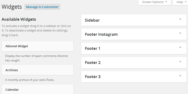 There are 5 widget ares for this theme. Go to Appearance > Widgets to use them.